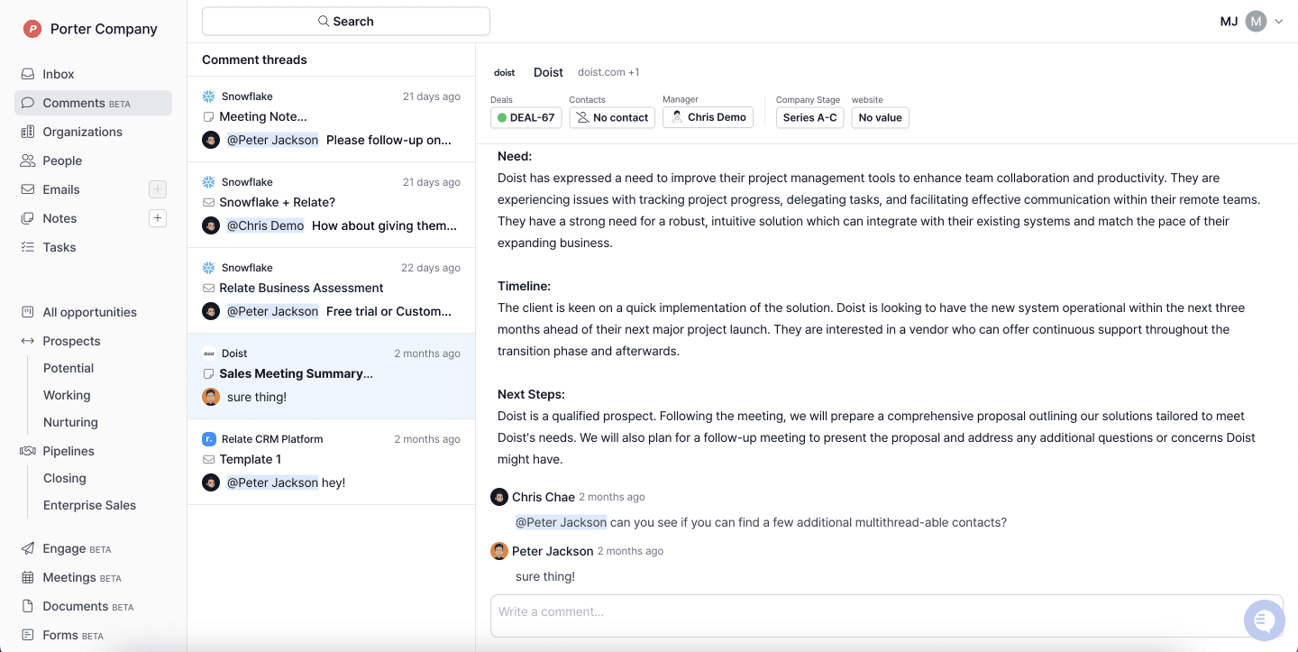 Comments beta simplifies internal communication and notification management. Notifications are now split between Inbox and Comments beta. Inbox is for customer emails, major updates, reminders, and task notifications. Comments beta handles notifications for comments on emails or meeting notes, enhancing team collaboration and discussion.