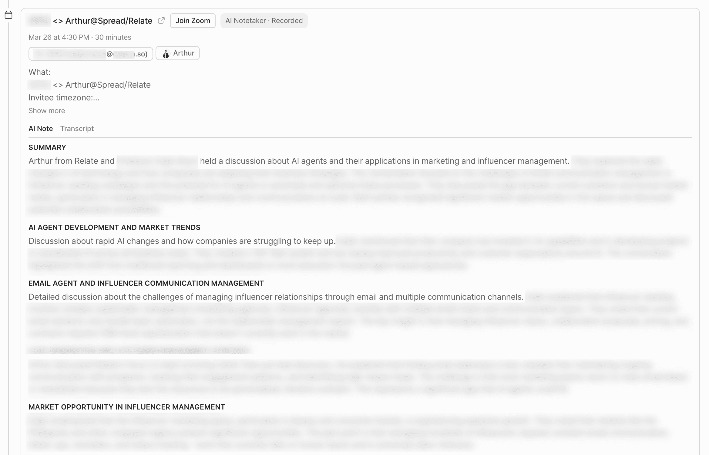Relate Notetaker is an AI meeting notes feature that automatically joins video calls, records the conversation, and saves meeting notes to Relate's activity feed and calendar.