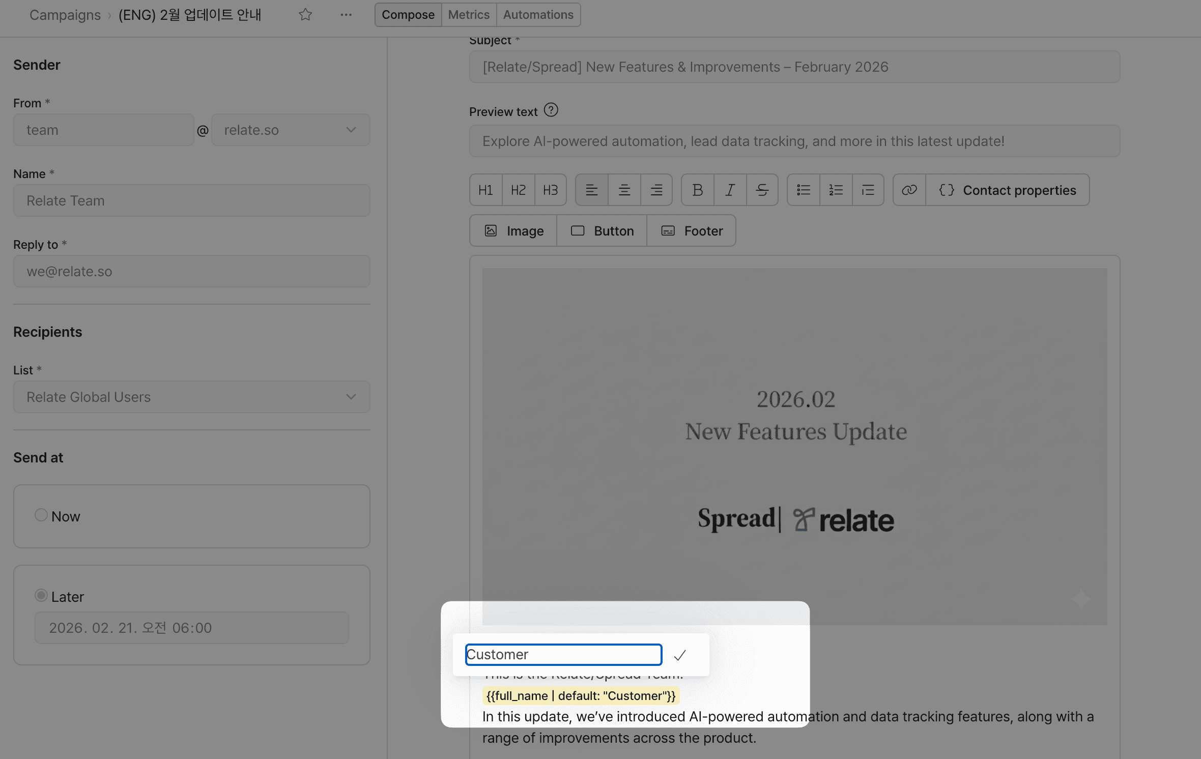 When using personalization variables in campaign or sequence emails, the interface for setting fallback values for empty fields has been updated to be more intuitive.